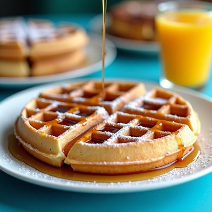 With strawberries, banana, lightly powdered sugar on top, whipped cream & syrup.